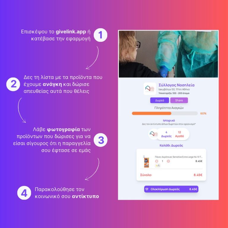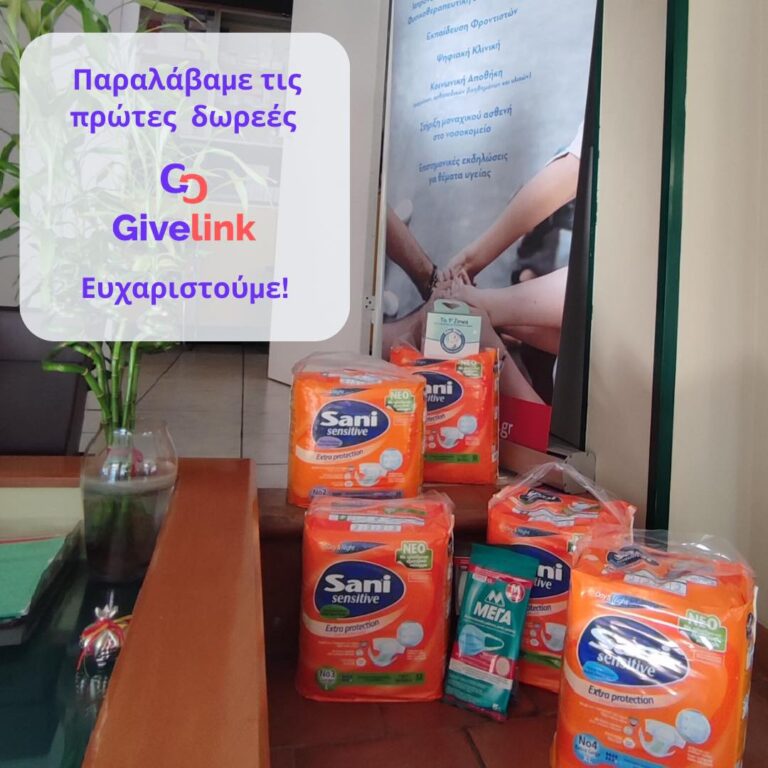 H Givelink είναι μια καινοτόμα πλατφόρμα δωρεών, η οποία αλλάζει τον κόσμο της φιλανθρωπίας. Μέσω της πλατφόρμας μπορεί να δει κάποιος τις πραγματικές ανάγκες των ασθενών της Νοσηλείας, να αγοράσει και να δωρίσει ό,τι ακριβώς χρειάζονται σε προϊόντα, ενώ ταυτόχρονα μπορεί να μετρήσει τον πραγματικό αντίκτυπο της δωρεάς του καθώς και να βεβαιωθεί ότι η βοήθειά του φτάνει πραγματικά στους ανθρώπους που την έχουν ανάγκη.