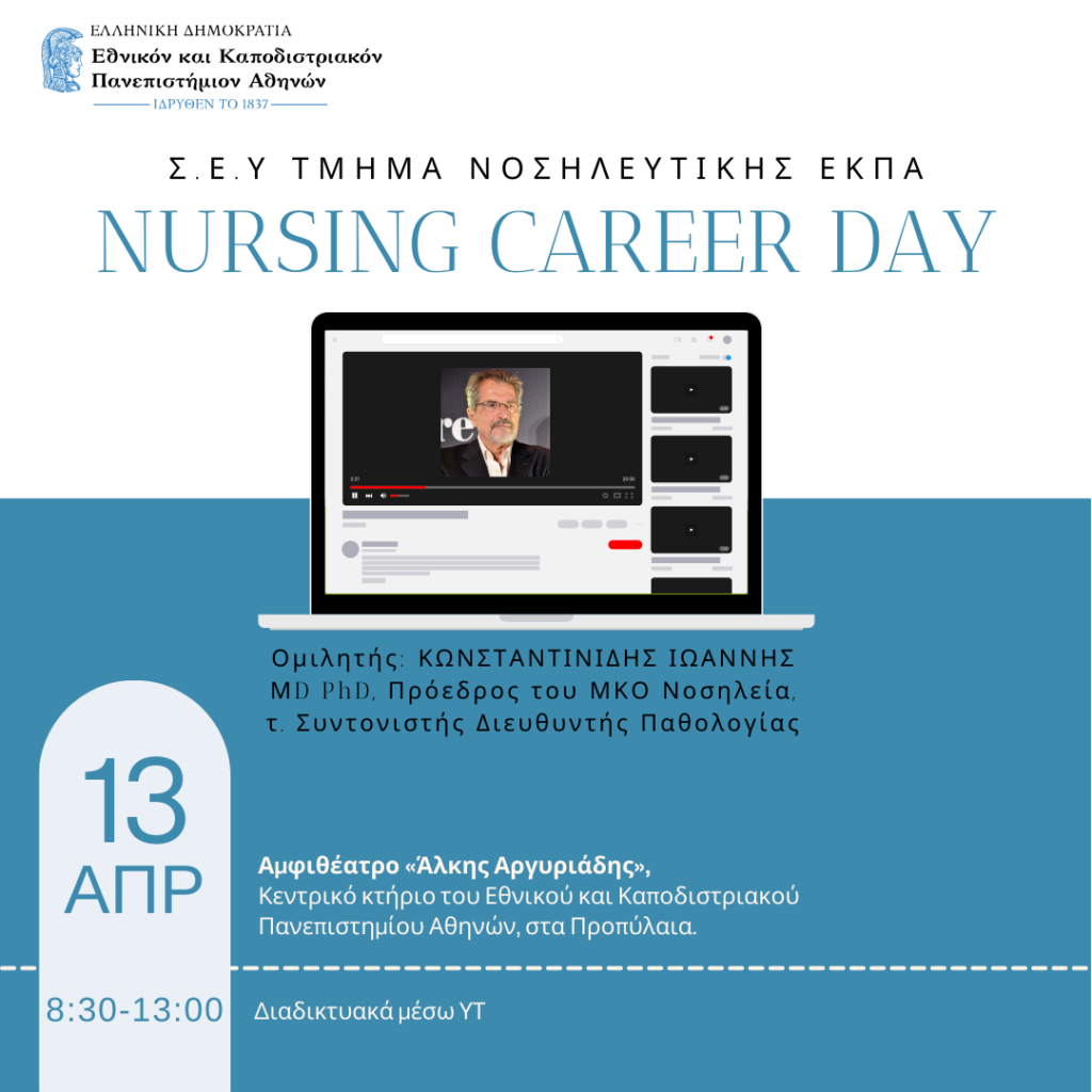 Ο πρόεδρος της Νοσηλείας, κ. Κωνσταντινίδης θα είναι ομιλητής στην Ημέρα Καριέρας 2024 του τμήματος Νοσηλευτικής του ΕΚΠΑ που θα πραγματοποιηθεί στις 13.04.24.